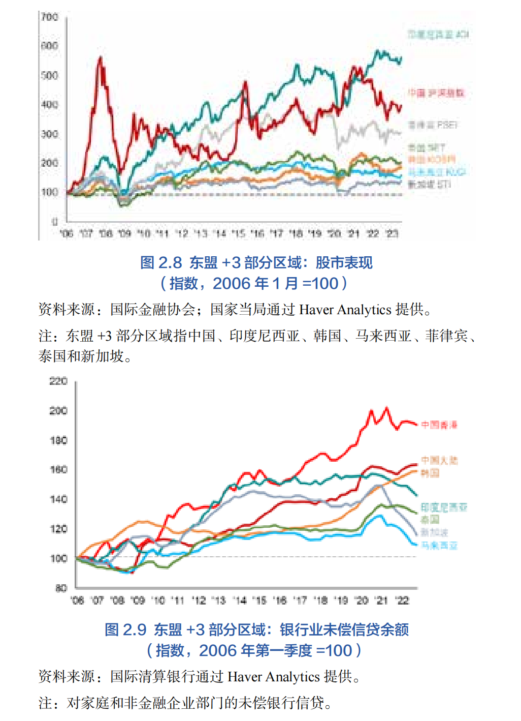 自全球金融危機以來,由于全球經濟需求長期疲軟、主要發達經濟體的中央銀行采用非常規貨幣政策以促進經濟增長,金融部門進入動蕩頻繁、市場波動率高的時代。在此背景下,本區域資本流動激增、資產價格持續上漲、匯率升值且信貸大幅擴張。各國央行長期實行超低利率政策,各國投資者逐利而動,大量外國資本流入東盟+3地區的新興市場國家——印度尼西亞、韓國、馬來西亞、菲律賓和泰國(圖2.6)。一些東盟經濟體逐步推行資本市場自由化政策,在某種程度上也促進了該區域的資本流入(Chua等,2013)。為應對流動性過剩問題,雖然各經濟體具體措施存在顯著差異,但該區域內大多數經濟體在積累外匯儲備的同時允許該國匯率對美元升值,從而應對這一挑戰。3印度尼西亞、韓國等經濟體在2010-2011年間的貨幣匯率迅速升值(圖2.7)。充裕的流動性也推動了該區域股市的發展,部分國家的基準指數在2009年1月至2013年4月期間屢創新高,如韓國、印度尼西亞和菲律賓(圖2.8)。無獨有偶,銀行業尚未償還的貸款余額在短時間內急劇增加,特別是在中國香港、印度尼西亞和新加坡,這一指標已超過了國內生產總值的140%(圖2.9)。