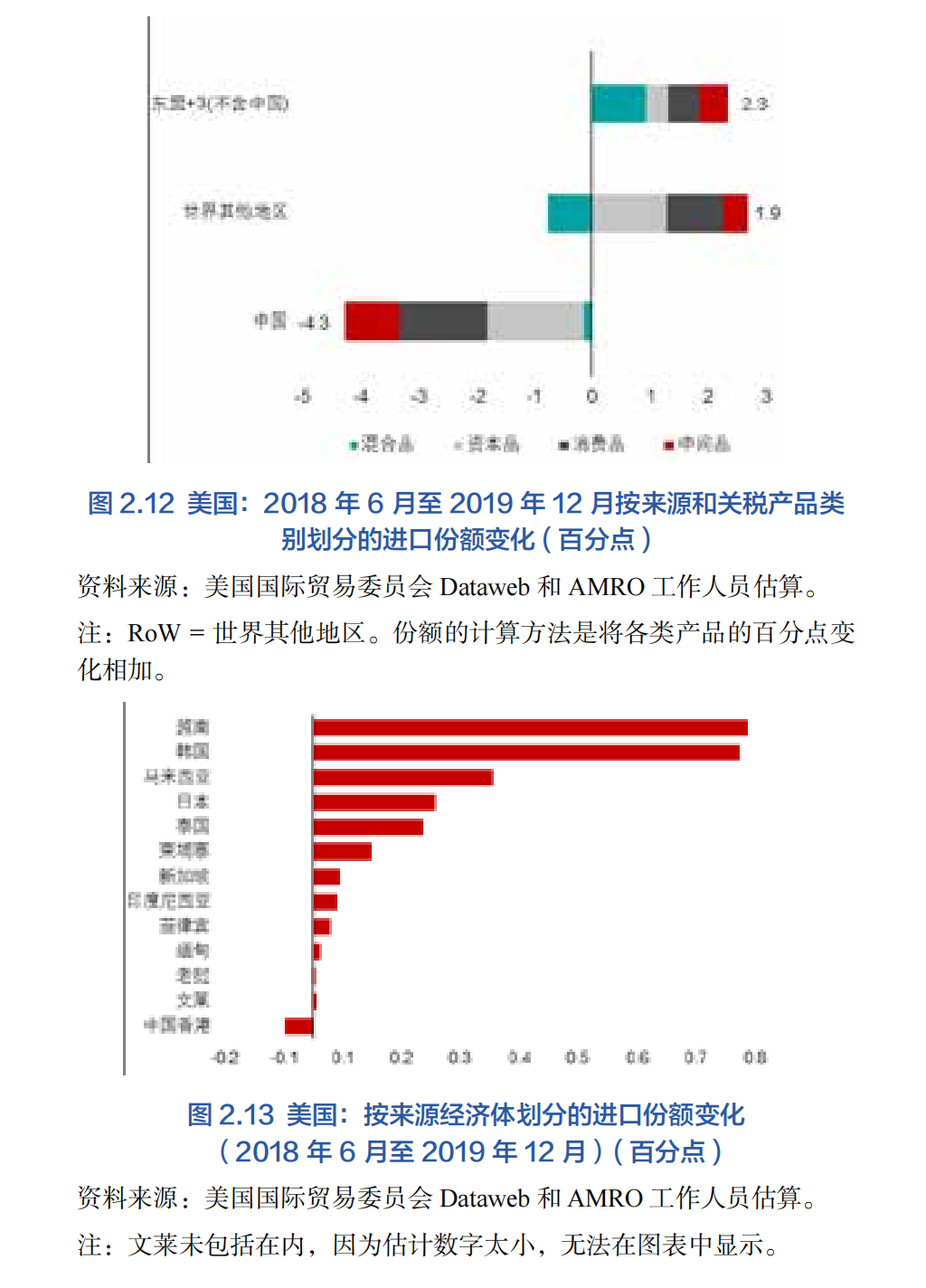 2016年底,特朗普贏得總統大選,投資者因擔心美國的貿易政策,尤其是與中國的貿易政策,紛紛涌向傳統的避險資產,全球新興市場再次陷入低迷。與全球金融危機之前不同的是,中美貿易關系在隨后兩年(2018-2019年)面臨嚴峻考驗,中美貿易緊張局勢升級,導致中國對美出口急劇下降。由于中國的汽車和電子產品出口與東盟+3地區高度相關,中美貿易緊張局勢的擔憂在該區域的全球價值鏈中廣泛傳播。盡管貿易緊張局勢加劇,但在一定程度上區域內一些經濟體可從之后的貿易轉移中受益。圖2.12顯示,與世界其他地區相比,東盟+3地區(不包括中國大陸)從美國進口格局轉移中受益最大。雖然地區出口總額仍然疲軟,但2018年6月至2019年12月期間,部分經濟體在美國進口總額中所占份額不斷增加。這一數據表明,美國從中國進口商品中降低的大部分份額被其從東盟+3地區(中國大陸除外)經濟體的進口所抵消(圖2.13)。這一積極的發展態勢表明,該區域與中國產品市場存在一定程度的替代性,該地區將會繼續從貿易轉移中受益,特別是區域中與中國出口產品相似度較高的地區。