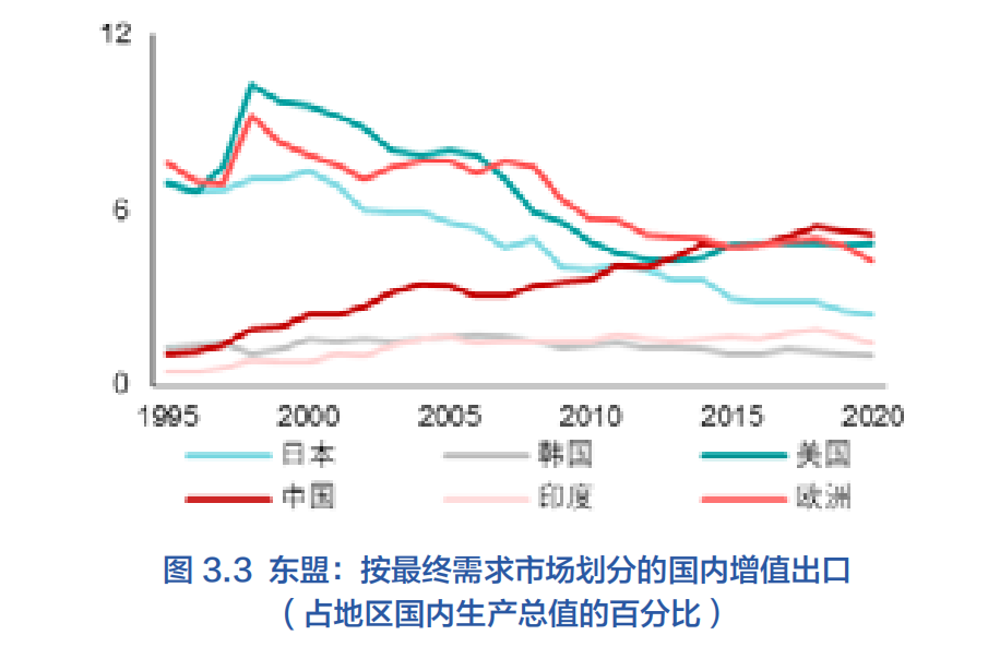 這一下降也反映在該地區的次區域貿易中,如:東盟和+3地區各自的區域內貿易份額在過去10年中也有所下降(圖3.2),然而,“東盟+3”整體的區域內貿易份額并沒有大幅下降,而且仍然高于各次地區的份額。這表明東盟經濟體正在與其+3鄰國進行更多的一體化和貿易,反之亦然。東盟與中國中間產品緊密的貿易聯系是這一趨勢的基礎。事實上,自2008-2009年全球金融危機以來,中國一直保持著東盟最大貿易伙伴的地位(新華社,2022)。此外,雙邊貿易的性質也發生了變化。中國與東盟經濟體的貿易傳統上以中間產品為主,中國再向美國等其他市場出口最終產品。然而,從增值額份額的角度深入研究中國東盟貿易的性質,可以發現東盟與中國的貿易正由中間品貿易轉為滿足中國需求的最終品(圖3.3),促進了該地區的增長動力的調整(見第二節的討論)。例如,2021年,中國吸收了東盟區域各國的國內價值增值總額中出口部分的20%,而這一比例在2000年僅為6%(圖3.4)。不過,各國的情況也不盡相同:在東盟10個經濟體中,中國已經取代美國成為了其中7個經濟體的國內價值增值總額中出口部分的最大消費國(主要是在全球金融危機之后)。6這表明經濟增長——尤其是該區域內高度開放和依賴貿易的經濟體的增長——與中國的需求有著千絲萬縷的聯系,而且今后這一現象將愈發顯著。