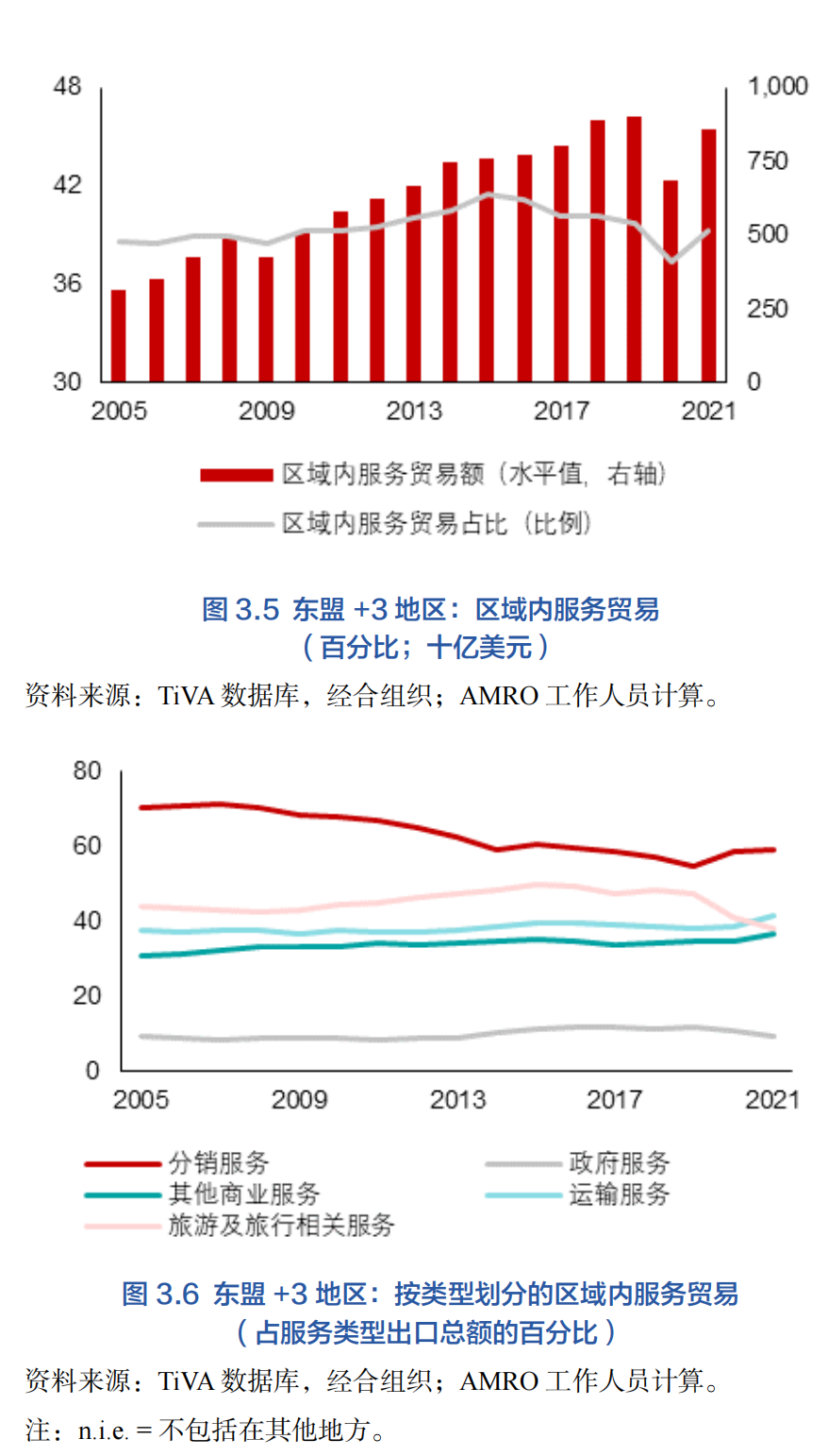 區域內服務貿易雖然落后于貨物貿易,但也取得了長足的進步——平均來說,2013年至2021年間區域內服務貿易占區域服務貿易總額的40%(圖3.5)。因為東盟是制成品的主要加工和組裝地,這反映了外國直接投資(FDI)從+3經濟體流向東盟的的強勁勢頭7。然而,隨著時間的推移,這一比例有所下降,這很可能是因為東盟幾個經濟體正逐漸超越簡單的組裝,進入制造業價值鏈中附加值更高的環節——例如設計和制造(AMRO2021)。受益于多年來區域內游客的強勁增長,本區域的旅游服務業有所增長,發揮了重要作用。雖然旅行服務因新冠疫情而受挫,但因為與貨物相關和其他商業類別(包括信息和通信技術及其他現代服務貿易)的復蘇抵消了旅行服務的下降,東盟+3地區的整體服務貿易在2021年得以迅速反彈(圖3.6)。