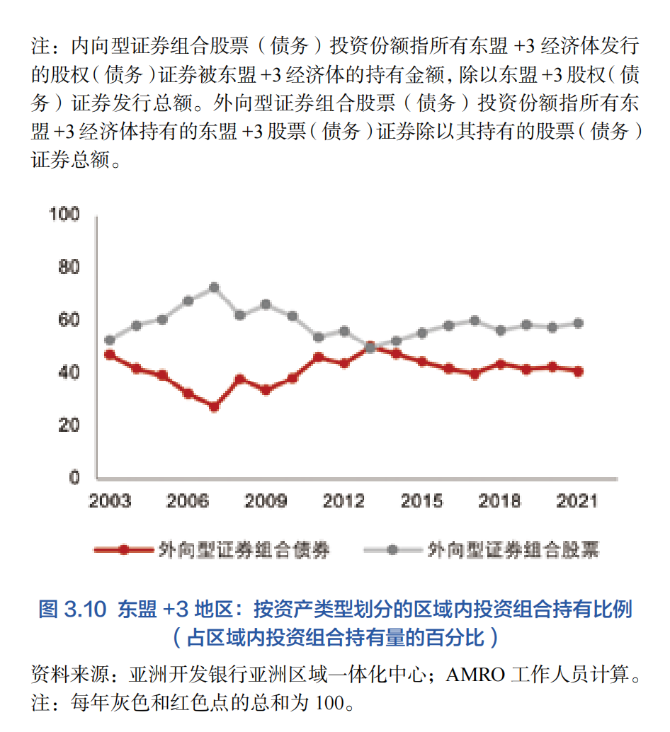 令人鼓舞的是,與跨境資本流動相關的其他指標表明東盟+3地區金融市場之間的聯系日益緊密。雖然與貿易一體化和外國直接投資一體化相比,這些指標仍然較低,但它們表明,在該地區強勁的宏觀經濟基本面和穩健的增長前景推動下,東盟+3地區內部對金融資產的興趣日益濃厚。截至2021年,在債券市場的深化和擴大的背景下,東盟+3地區國際債務發行總額的近30%區域內持有(圖3.9)。雖然這一份額在2013年后,即“縮減恐慌”之后有所下降,但該地區發行新債的意愿并未得到大幅削弱。在股票投資方面,東盟+3地區內投資者大約持有該地區股票發行總額中的20%;這一比例雖然略低于債券,但在過去幾年中迅速增長。+3經濟體是最大的區域內發行者。就持有量而言,東盟+3地區內證券投資占成員經濟體總投資組合(債務和股票)的不到20%。有趣的是,在過去10年中,該地區的投資者似乎越來越傾向于持有更多的東盟+3股票,而不是債務——這很可能是由于超低收益的國際環境所致(圖3.10)。