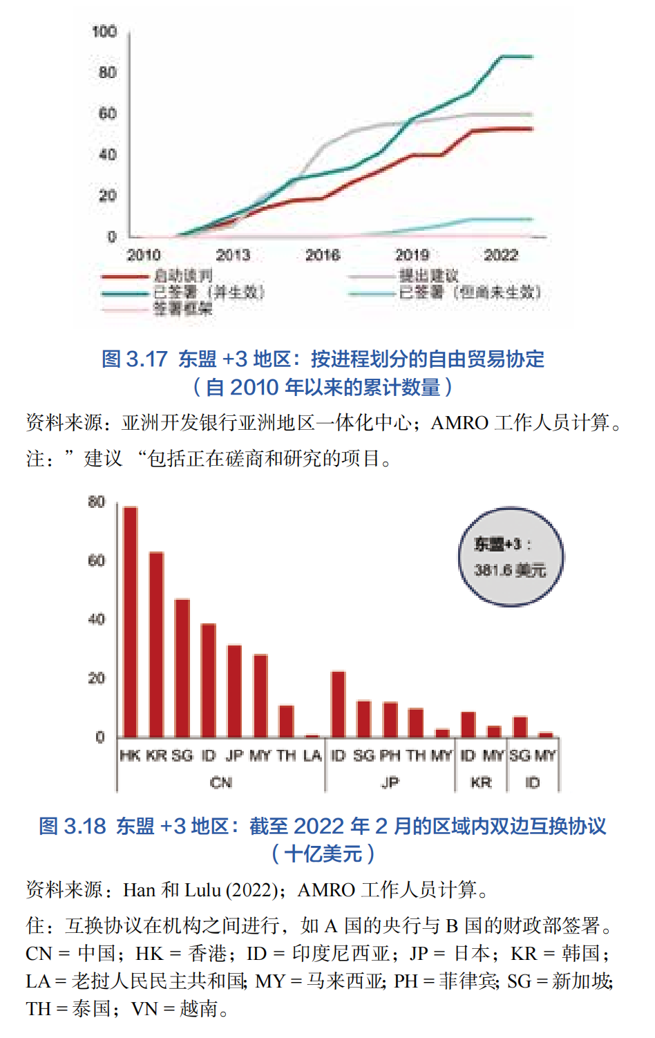 在金融方面,區域金融合作多年來同樣取得了巨大的飛躍。自1997年以來,“東盟+3”經濟體基于亞洲金融危機進行合作,并從中汲取經驗教訓,就如何進一步改善本地區的經濟和金融監管合作、加強危機應對能力、構建安全合作網絡以及促進本幣債券市場的發展開展密切合作(Khor, Guinigundo 和 Kawai, eds., 2022)。例如,2010年3月,用以支持東盟+3成員國之間流動性支持的多邊貨幣互換機制,清邁倡議多邊化(CMIM)協議正式生效,初始規模為1200億美元。13東盟和中日韓宏觀經濟研究辦公室(AMRO)于次年成立,負責對地區經濟進行監督,并支持這一地區金融安排的實施。此后,清邁倡議多邊化(CMIM)協議得到了進一步加強——2014年,該機制的規模翻了一番,達到2400億美元;2021年,各成員修訂了這一協議,將使用美元以外的成員國本幣制度化(AMRO 2023b)。除了CMIM之外,東盟+3區域內雙邊互換安排(BSAs)的規模和數量也有所增長(圖3.18)。其中90%涉及當地貨幣的東盟+3雙邊互換安排的擴大協議發生在已經建立貿易和金融聯系的經濟體。例如,東盟內部的互換協議側重于促進貿易和投資中的本幣結算,而《日本-東盟互換協議》則主要出于保持金融穩定和支持短期流動性的需求(Han 和 Lulu,2022)。